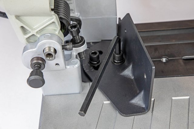 Úhlový doraz plynule nastavitelný v rozsahu 0-45° - jednoduché a přesné pokosové řezy