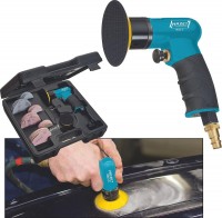 Málá pneumatická bruska v sadě Hazet 9033-5 je dodávána s dvěmi brusnými talíří o průměru 50 mm a 76,2mm, 15x brusný kotouč 500mm zrnitosti 320(5x), 400(5x), 600(5x) dále 15x brusný kotouč 76,2mm o zrnitosti 320 (5x), 400 (5x) a 600 (5x)