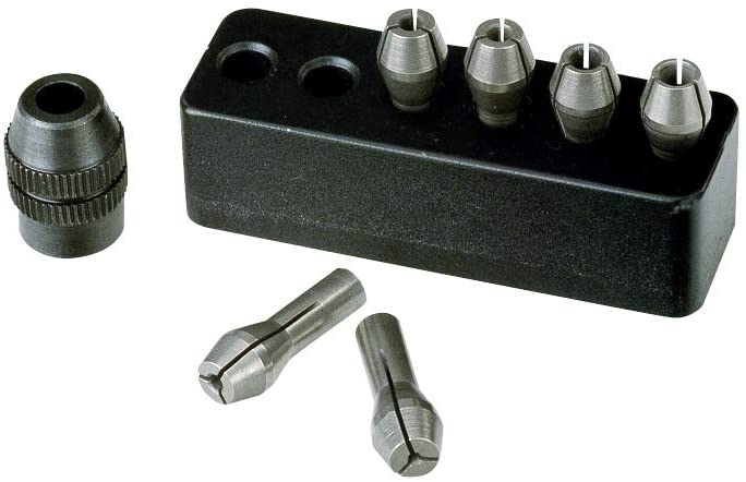 Se šesti tříčelisťovými ocelovými kleštinami (1,0 – 1,5 – 2,0 – 2,4 – 3,0 a 3,2 mm včetně upínací matice)
