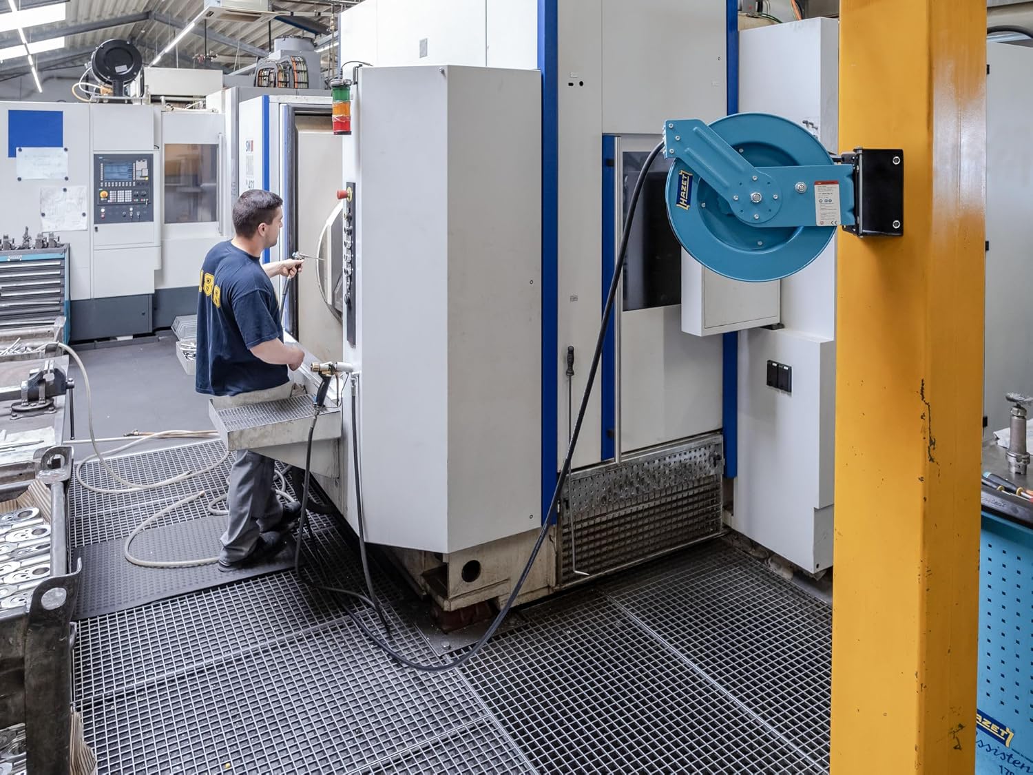Automatický naviják na hadici vytváří pořádek v dílně – žádná hadice se nepovaluje, což snižuje riziko nehod.