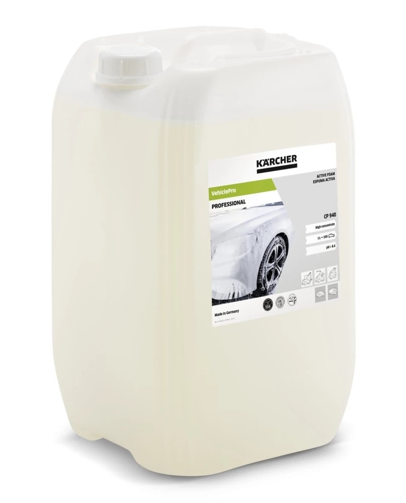 Lehce alkalický autošampon vytváří stabilní pěnu v zařízeních Clean park a samoobslužných mycích zařízeních, chrání povrchy a dobře se oplachuje, citronová vůně. Ideální pro mytí vozidel kartáči v samoobslužných mycích systémech, ale také velmi vhodný pro použití ve vysokotlakých čističích s pěnovými tryskami, mimořádně úsporný mycí prostředek Aktivní pěna CP 940 od společnosti Kärcher pro důkladné a šetrné mytí osobních a užitkových vozidel. Aktivní pěna je určena pro použití za mokra i za sucha s kartáčem a vytváří jasnou a objemnou pěnu, která bez námahy rozpouští olej, mastnotu a minerální znečištění a zároveň zvyšuje kluznost kartáče pro šetrné čištění. Kromě toho koordinace s následnými voskovými produkty zabraňuje vzniku šmouh na laku a snižuje opětovné znečištění kartáčů. Povrchově aktivní látky obsažené v CP 935 jsou biologicky odbouratelné v souladu s OECD, takže je šetrný k životnímu prostředí a v odlučovači oleje velmi rychle odděluje olej a vodu.