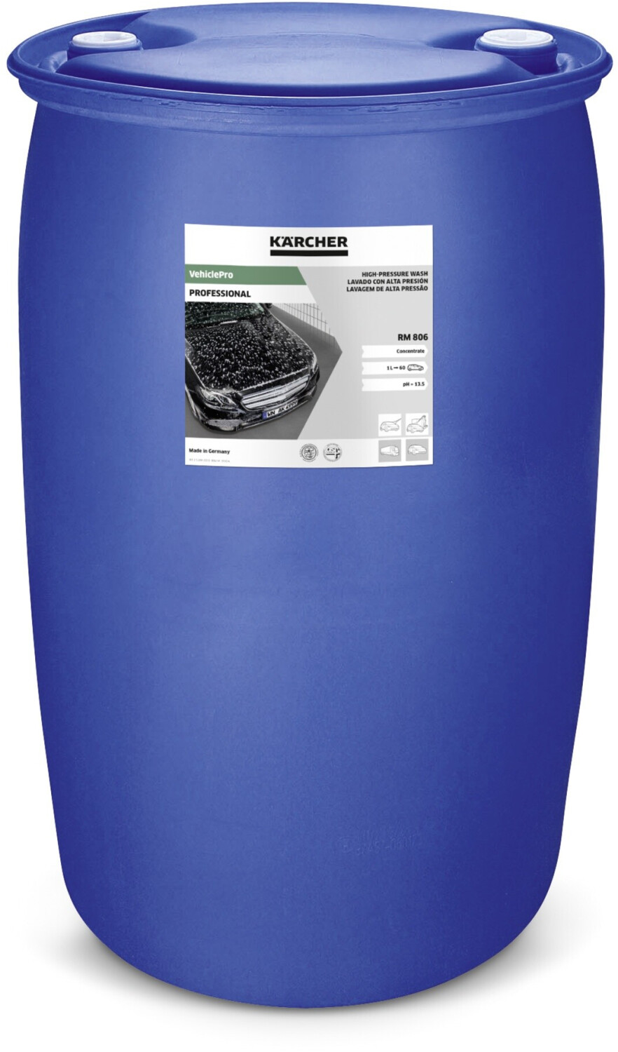 Univerzálně použitelný pro mytí automobilů, užitkových vozidel, kol a motorů, výkonný vysokotlaký mycí prostředek VehiclePro RM 806 pro použití na samoobslužných mycích stanicích. Ultra účinný vysokotlaký čisticí prostředek bez NTA rozpouští i ty nejodolnější zbytky oleje, mastnoty, bláta, hmyzu a mízy stromů. Rychle odděluje olej a vodu v odlučovači oleje, zatímco povrchově aktivní látky, které obsahuje a které jsou biologicky odbouratelné v souladu s EEC 648/2004, pomáhají zajistit ekologické mytí vozidel. A co víc, koncentrát z řady VehiclePro Kärcher přesvědčí vysokou výtěžností až 60 mytí auta na litr.