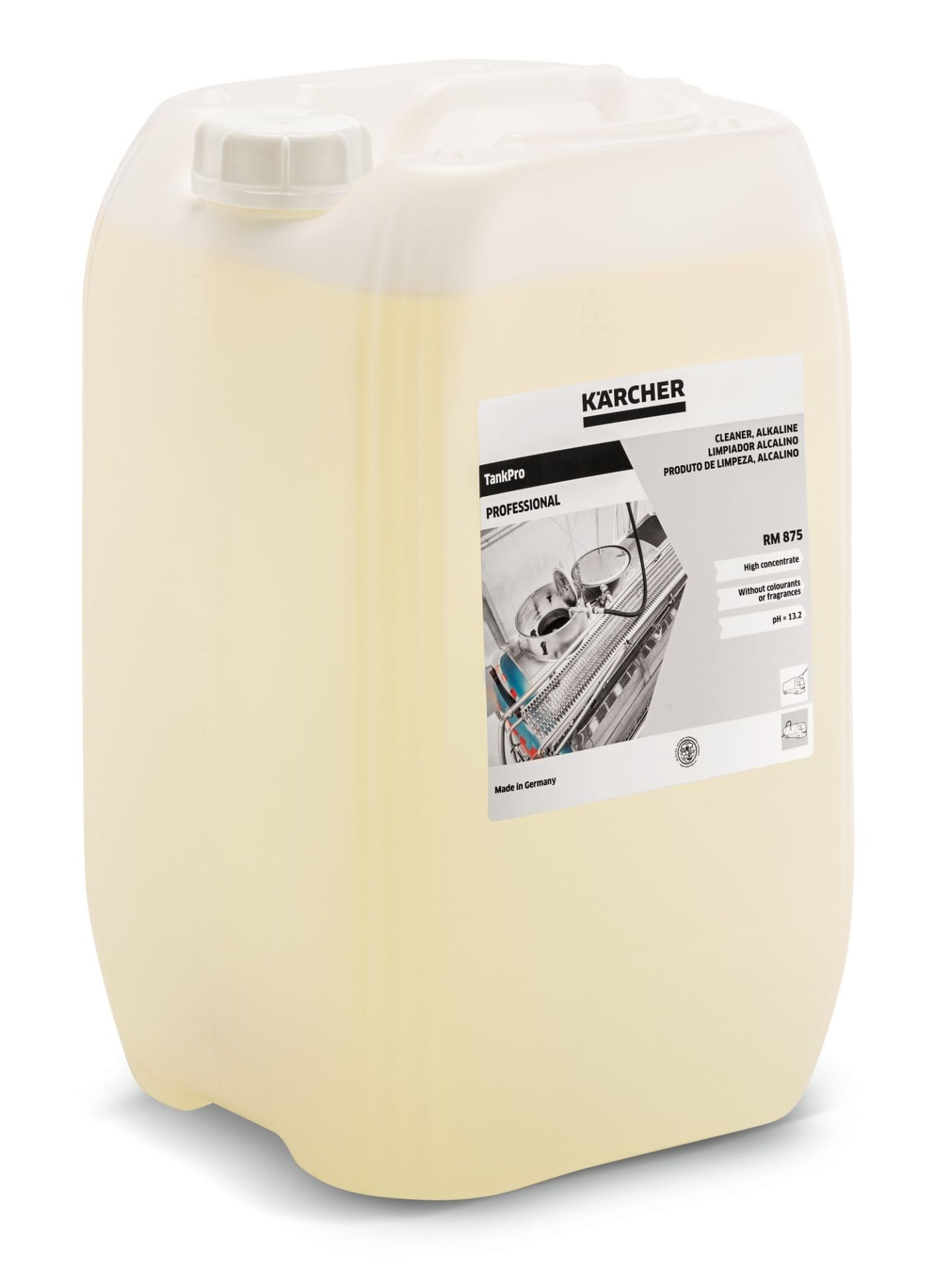 Alkalický (ph 13) a nízkopěnivý čistič nádrží RM 875 pro použití s ručními stříkacími jednotkami, vysokotlakými čističi a v čistících stanicích pro čištění interiéru nádrží v logistice, chemickém a potravinářském průmyslu. Výkonný mycí prostředek účinně odstraňuje zbytky jídla jako cukr, žloutek, oleje, tuky nebo čokoládu díky inhibitorům koroze je velmi šetrný k materiálům, dokonce i k nerezovým a hliníkovým povrchům. Čistič RM 875 bez parfemace a barviv a teplotně stabilní do 90 °C je ideální volbou pro důkladné vnitřní a vnější čištění cisteren, silo kontejnerů a ISO kontejnerů a je také vhodný pro použití na povrchy přicházející do styku s potravinami.