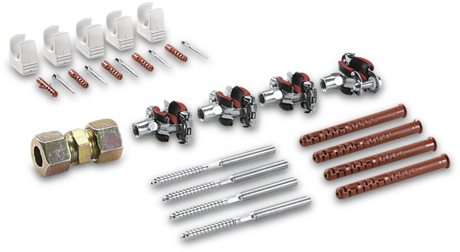 Sada vysokotlakého potrubí se 3 m dlouhou pozinkovanou ocelovou trubkou Ø 16 x 2 mm, ID 12 a upevňovacím příslušenstvím: řezný kroužek šroubení, 4 sponky, 4 šrouby a 4 plastové hmoždiny.