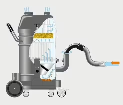 Výkonný průmyslový vysavač pro aplikace jemného prachu, ideálně vhodné pro údržbové čištění dílen a výrobních hal. Extra nízký a kompaktní průmyslový vysavač pro kovoprůmysl. Robustní konstrukce a malá plocha vysavače zajišťují dlouhou životnost v náročném každodenním průmyslovém podnikání. Zařízení je vybaveno dvěma výkonnými obtokovými motory a slouží k údržbovému čištění v dílnách nebo výrobních halách. Vnitřní zesílený kapesní filtr (třída prachových filtrů M) s velkou filtrační plochou (1,4 m²) a efektivním čištěním filtrů, stejně jako cyklónový systém předseparace, zajišťují bezpečný sběr jemných prachů. Nerezová sběrná nádoba je připojena k vysavači díky praktickému a snadno použitelnému usazovacímu mechanismu. Inteligentní zvuková izolace kombinuje příjemný pracovní hluk s pevným výkonem. Díky kvalitním kolečkům a malým rozměrům ohromuje IVR 35/20-2 Pf Me svou vynikající mobilitou a maximální provozní flexibilitou.