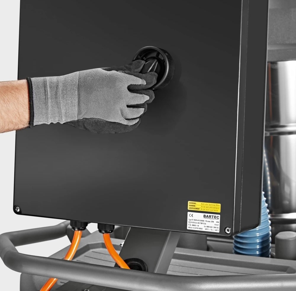 Pro bezpečné vysávání velkého množství zdraví škodlivého prachu s certifikátem pro třídu prachu M a kromě toho i schválený pro výbušnou zónu 22, náš průmyslový vysavač ze super třídy do výbušného prostředí IVS 100/55 M Z22 s výkonným 5,5 kW odstředivým kompresorem. Vysoce efektivní stroj (IE2) je vhodný jak pro stacionární, tak i pro mobilní používání v trvalém provozu. Díky integrovanému pozvolnému rozběhu ho lze provozovat dokonce i z běžných průmyslových zásuvek s jištěním 16 A. Horizontální oklepávání filtru garantuje kdykoli optimální čištění velkého růžicového filtru s certifikátem pro třídu prachu M. Převodovka s cíleným přenosem síly přitom zajišťuje konstantně dobrý výsledek čištění nezávisle na tom, kolik síly je uživatel schopen vynaložit. I mechanismus umístění 100 l nádoby pro vysávání suchých nečistot z ušlechtilé oceli podtrhuje přátelské ovládání stroje pro uživatele. Četné možnosti pro bezpečné uložení příslušenství doplňují promyšlený koncept.