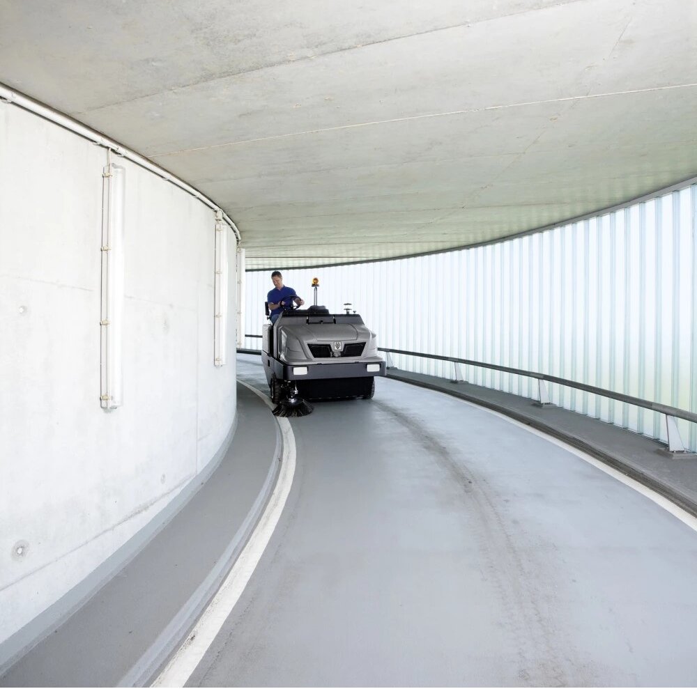 Zametací stroj s pohonem na baterie s tříkolovým zadním řízením zajistí jednoduchou manipulaci. Díky principu zametací lopatky jsou jemné a hrubé nečistoty bezpečně pojmuty. Při transportní jízdě se nádrž na zametené nečistoty automaticky uzavře. Zametací válec se automaticky přizpůsobí nerovnostem zametaného povrchu a je možné ho vyměnit bez použití nářadí. Dva vodorovně uložené ploché skládané filtry zajistí také i ve velmi prašném prostředí čistý vzduch. Čištění filtru probíhá po stisknutí tlačítka pomocí vysoce efektivní duální stěrky. Filtr je dobře přístupný a lze jej vyměnit bez pomoci nářadí. Základní funkce jsou díky konceptu EASY-Operation obsluhovatelné pomocí jednoho otočného tlačítka.