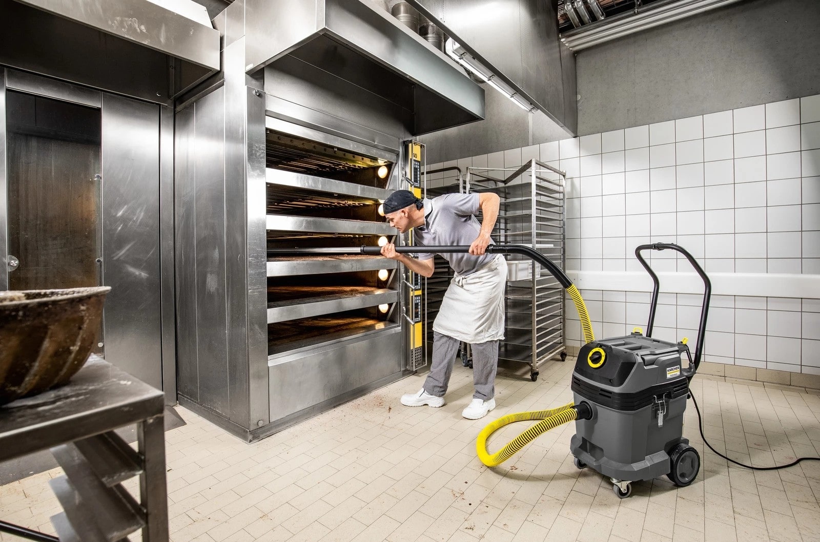 Díky našemu speciálnímu vysavači NT 40/1 Tact Bs mohou pekaři a cukráři vysávat podlahy, stroje nebo ostatní zařízení s volitelným příslušenstvím dokonce i pec. Vysavač zvládne bez námahy všechny výzvy, které ho v pekárně očekávají. Stabilní kovové uzávěry umožňují jeho certifikaci jako zařízení do výbušného prostředí a tím i vysávání potenciálního nebezpečného moučného prachu. Automatické čištění filtru Tact se přitom stará nejen o konstantně vysoký sací výkon, ale dovoluje i vysávání velkého množství jemného prachu. K tomu účelu je vysavač vybaven centrálním otočným přepínačem pro snadnou obsluhu, přičemž díky robustní nádobě zvládne bez újmy i práci v tvrdých podmínkách, zatímco ergonomická rukojeť mimořádně usnadňuje jeho přepravu.