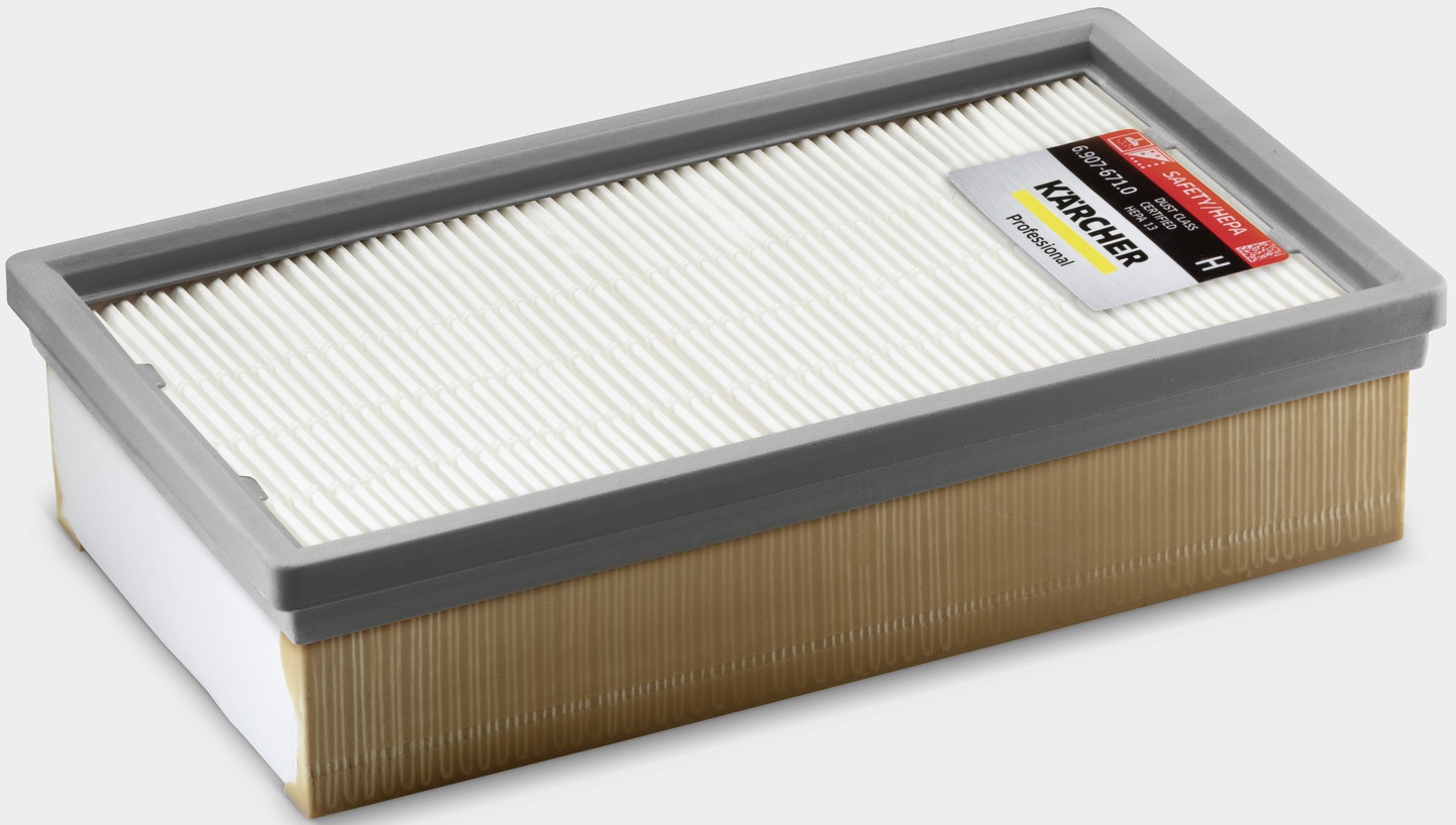 Bezpečnostní filtrace včetně plochého skládaného filtru třídy H s PTFE povlakem, který zadržuje 99,995 % prachu