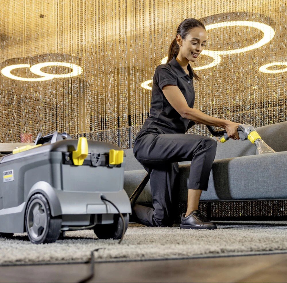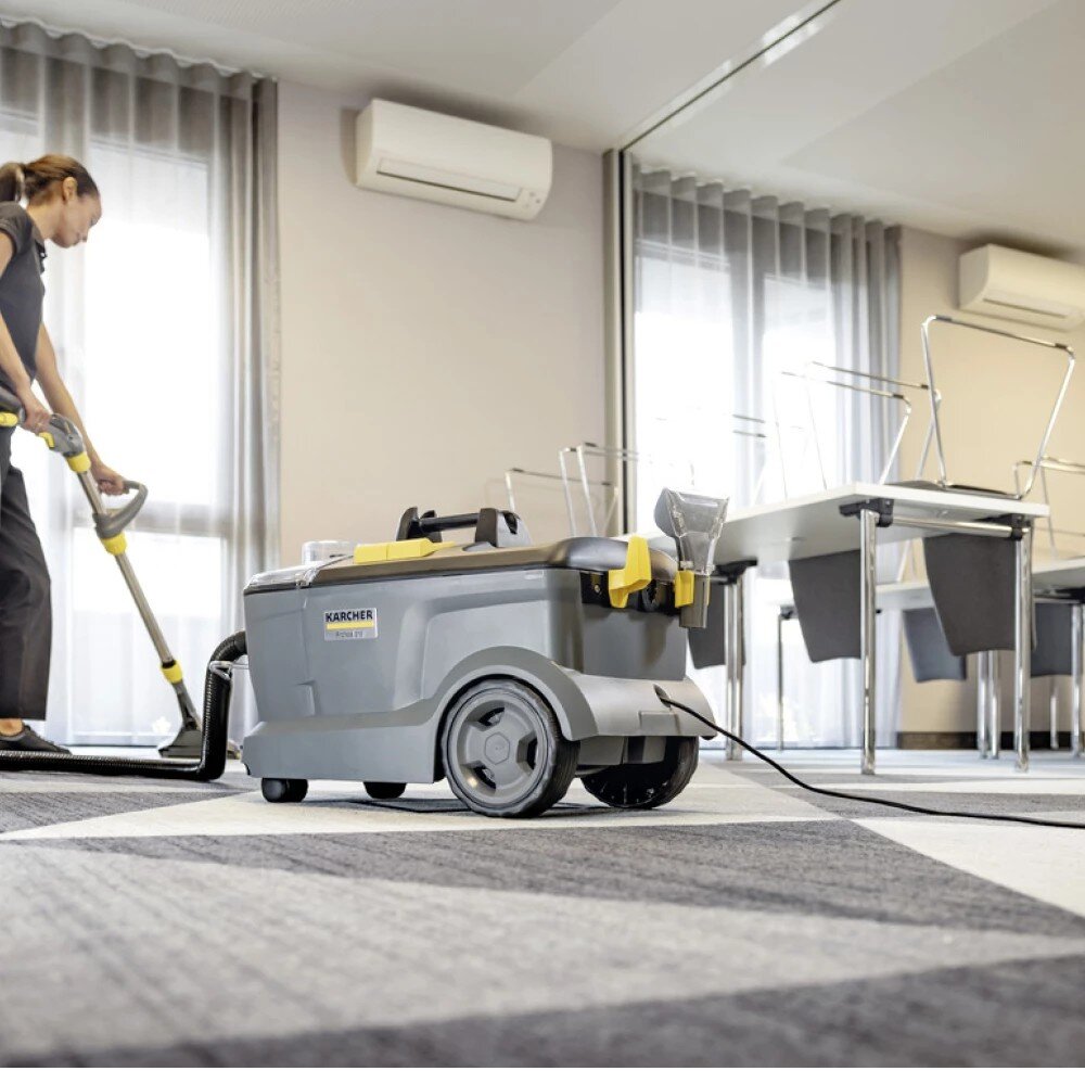 Všestranný extraktor Puzzi 10/1 oceníte při úklidu menších kanceláří a společenských místností. Nástřikový tlak o hodnotě 1 bar umožní šetrné hloubkové čištění koberců a čalounění. Přístroj navíc zanechává povrchy téměř suché, takže je lze vzápětí opět použít. Úzká podlahová hubice se dokonale hodí pro úklid stísněných prostor. Její flexibilní sací stěrka zajistí perfektní kontakt s povrchem, i když vysáváte pod nábytkem. Při péči o čalounění se osvědčí také praktická ruční hubice. Ergonomická, výškově nastavitelná rukojeť zajistí maximální komfort při práci. Úklid ulehčí rovněž objemná 9l nádoba na špinavou vodu, kterou jednoduše vyjmete a vylijete. A když je hotovo, kabel i sací trubky snadno připevníte k přístroji a extraktor pohodlně uskladníte, stroj je vybaven stříkací a sací hadicí o délce 4 m.