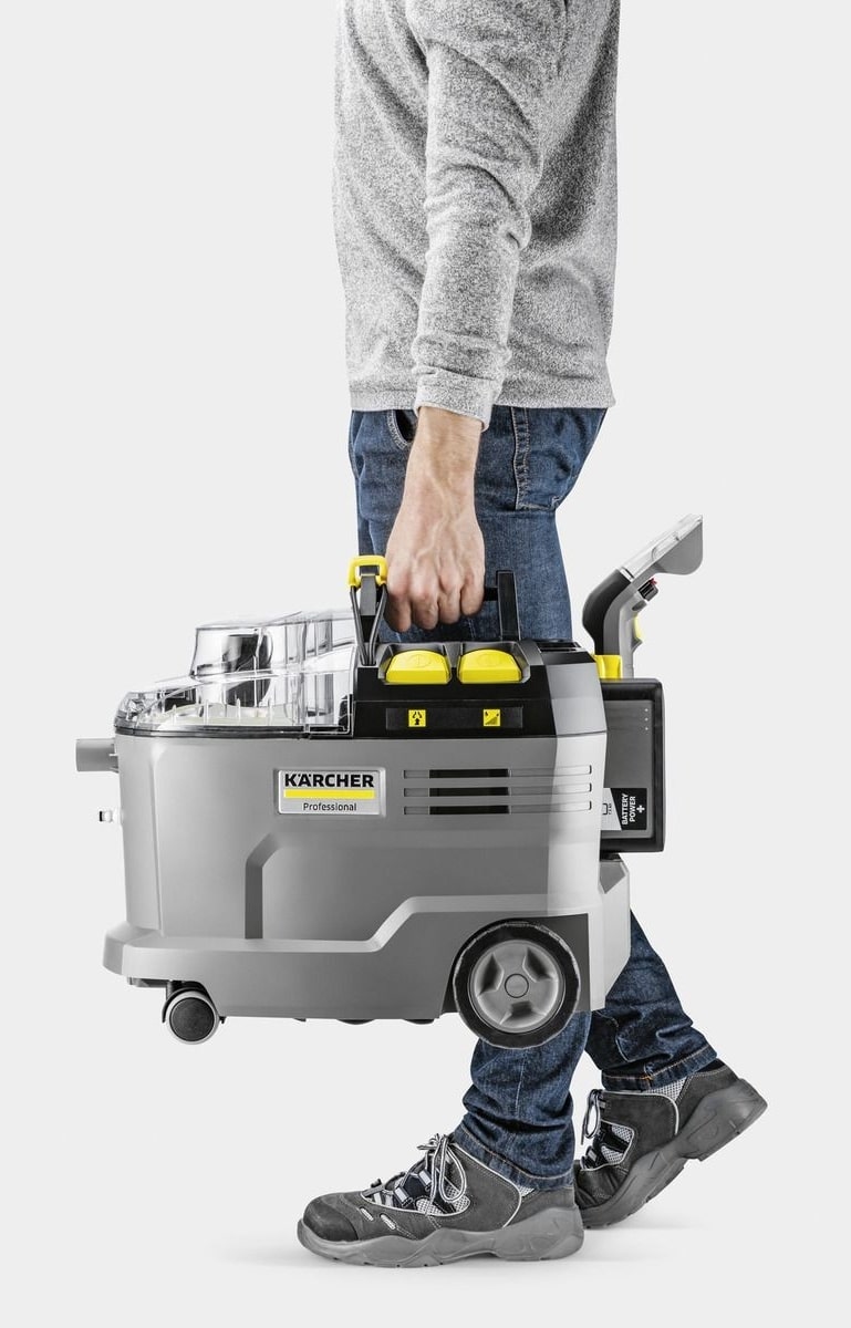 Vůbec první svého druhu: Puzzi 9/1 Bp Pack Adv patří mezi první aku extraktory v profesionální třídě. Nabízí maximální flexibilitu a je to všestranný pomocník pro čištění textilních vláken. Efektně vyčistí nejen čalounění, ale díky podlahové hubici i veškeré koberce. Vysoký nástřikový tlak přístroje umožní hygienické čištění až do hloubky vláken. Extraktor si tak poradí i s usazenou špínou, čisticí roztok je natlakován hluboko do vláken a poté nasáván zpět spolu s uvolněnými nečistotami. Kromě toho pracuje tiše, takže při úklidu zbytečně nerušíte hosty. Znečištěná voda stéká do objemné 7l nádrže, kterou po práci snadno vyjmete a vylijete. Zařízení se snadno přenáší i v jedné ruce a díky aku pohonu nepotřebuje žádné kabely. Čistič koberců a čalounění pohodlně zapnete pouze sešlápnutím nohy bez potřeby ohýbání se. Potřebnou energii zajišťuje kvalitní 36V baterie s displejem, na kterém zobrazíte aktuální stav nabití. A když máte uklizeno, příslušenství jednoduše uchytíte na šasi přístroje, takže extraktor při skladování nezabere příliš místa a žádné příslušenství se vám už neztratí. Baterie a rychlonabíječka jsou součástí dodávky a lze je kombinovat i s dalšími stroji Kärcher o bateriové platformě 36 V.