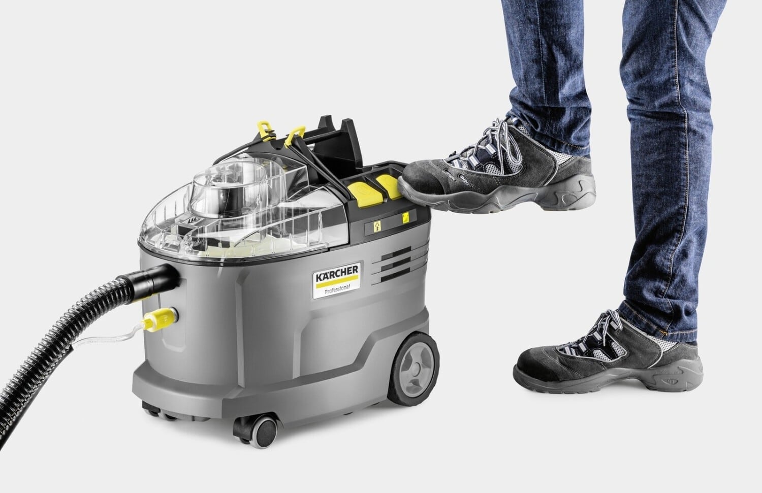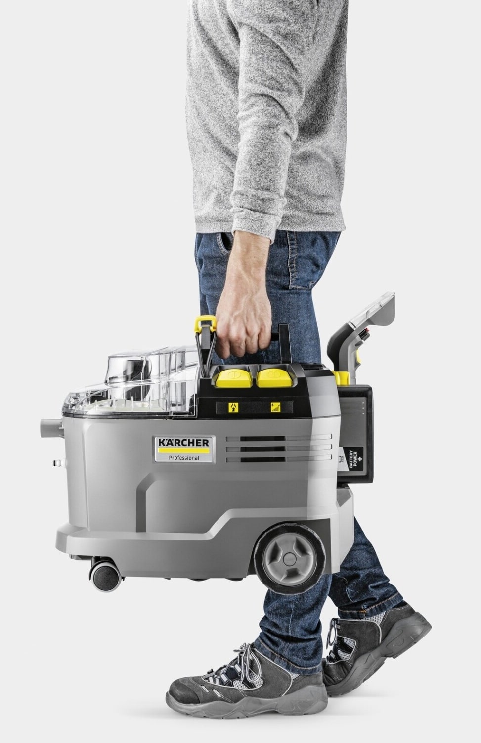 Unikátní, první bateriový extraktor pro profesionální účely vůbec. Puzzi 9/1 Bp nabízí vysoký výkon maximální komfort při čištění čalouněných interiérů v jakémkoliv průmyslovém odvětví. Oceníte ho v hotelích, pohostinství i při údržbě vozidel. Přístroj pomocí vysokého tlaku odstraní špínu až do hloubky vláken, čisticí roztok je natlakován a nastříkán do hloubky textilních vláken a poté vysáván zpět spolu s uvolněnými nečistotami. O potřebný výkon se stará silná 36 V baterie, na jejíž displeji si můžete kdykoliv ověřit zbývající čas chodu. Extraktor snadno zapnete nohou, takže nenamáháte záda. Při úklidu vám navíc nepřekážejí žádné kabely a díky tichému provozu ani nerušíte okolí - ideální pro veřejné prostory. Pohodlí při práci zajistí ultrakrátká hubice na čalounění a praktická rukojeť, díky níž se zařízení snadno přenáší i jednou rukou. Samozřejmostí je i nádoba 2 v 1 na čistou a špinavou vodu, kterou vylejete bez kontaktu s nečistotami. A nakonec i integrovaný úložný prostor pro příslušenství. Vše k přístroji tak bude vždy při ruce a nic se neztratí, baterie ani nabíječka nejsou součástí dodávky.