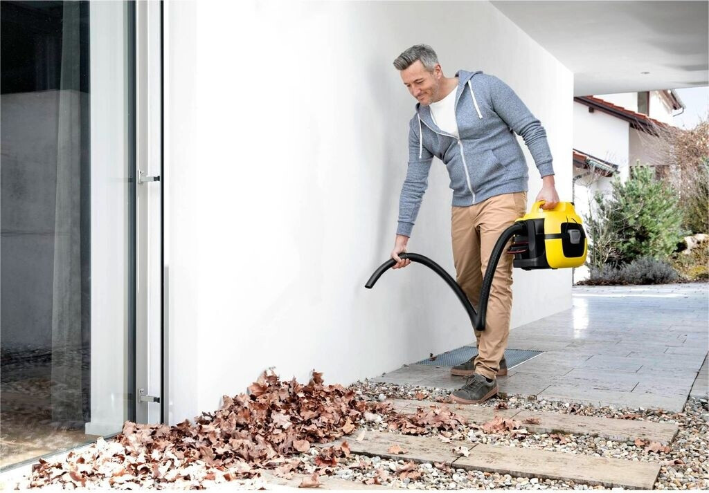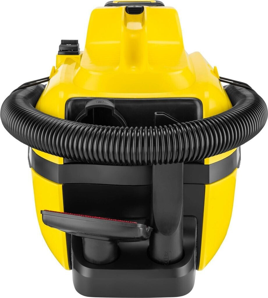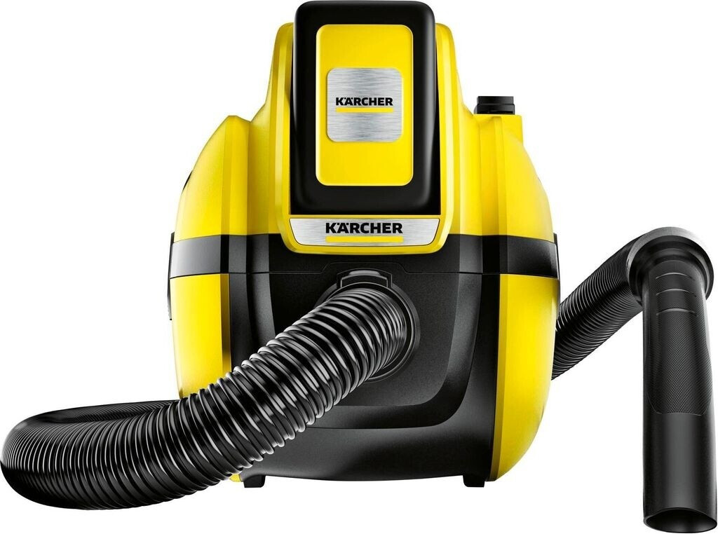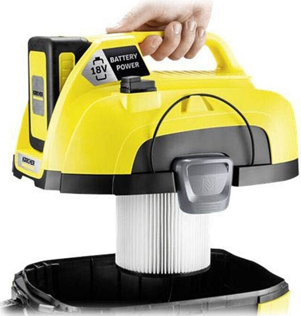 Víceúčelový AKU vysavač WD 1 Compact Battery Set (včetně baterie – platforma 18 V) je bezdrátový vysavač pro suché a mokré vysávání. Součástí je speciální příslušenství na čistění aut. Kompaktní průmyslový vysavač (baterie je součástí balení) je zcela nezávislý na elektrické přípojce. Díky tomu tak účinně vysajete suché u mokré nečistoty ze špatně dostupných míst. Doba saní přitom vydrží 10 až 20 minut. Výhodou je i technologie díky Real Time Technology, kdy na LCD displeji vidíte aktuální stav baterie (doba nabíjení i vybití). Součástí je i robustní a nárazu odolná plastová nádoba s objemem 7 litrů. Díky patronovému filtru lze vysávat suché a mokré nečistoty bez výměny. Výhodou je i sací hadice vysavače s optimalizovaným prouděním nebo příslušenství zvlášť vhodné pro čištění interiéru vozů (štěrbinová hubice a hubice na polstrování). Příslušenství lze při přerušení práce nebo pro uskladnění pohodlně uložit přímo na vysavači. Další výhody, funkce fukaru, uzavírací systém „Pull & Push“, ergonomická rukojeť a kompatibilní baterie 18 V, tu lze využít i pro další techniku Kärcher o stejné platformě.
