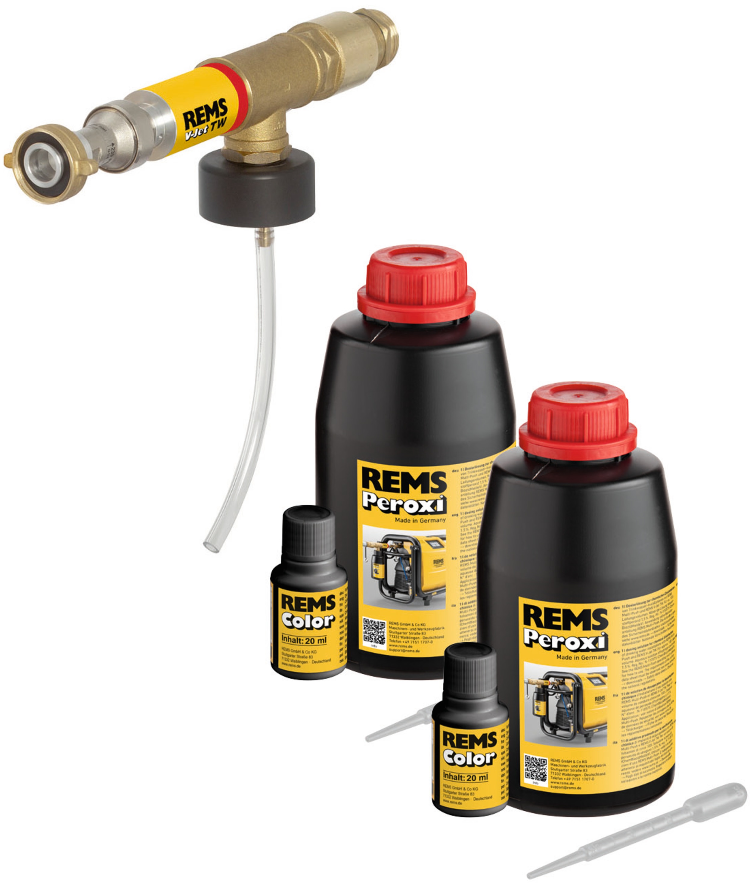 REMS Startovací sada TW je určená k profesionální dezinfekci rozvodů pitné vody a dalších potrubních systémů v kombinaci s proplachovacími jednotkami REMS Multi-Push. Sada využívá barevně značené dezinfekční roztoky, které umožňují vizuální kontrolu správného naplnění i následného vypláchnutí systému.