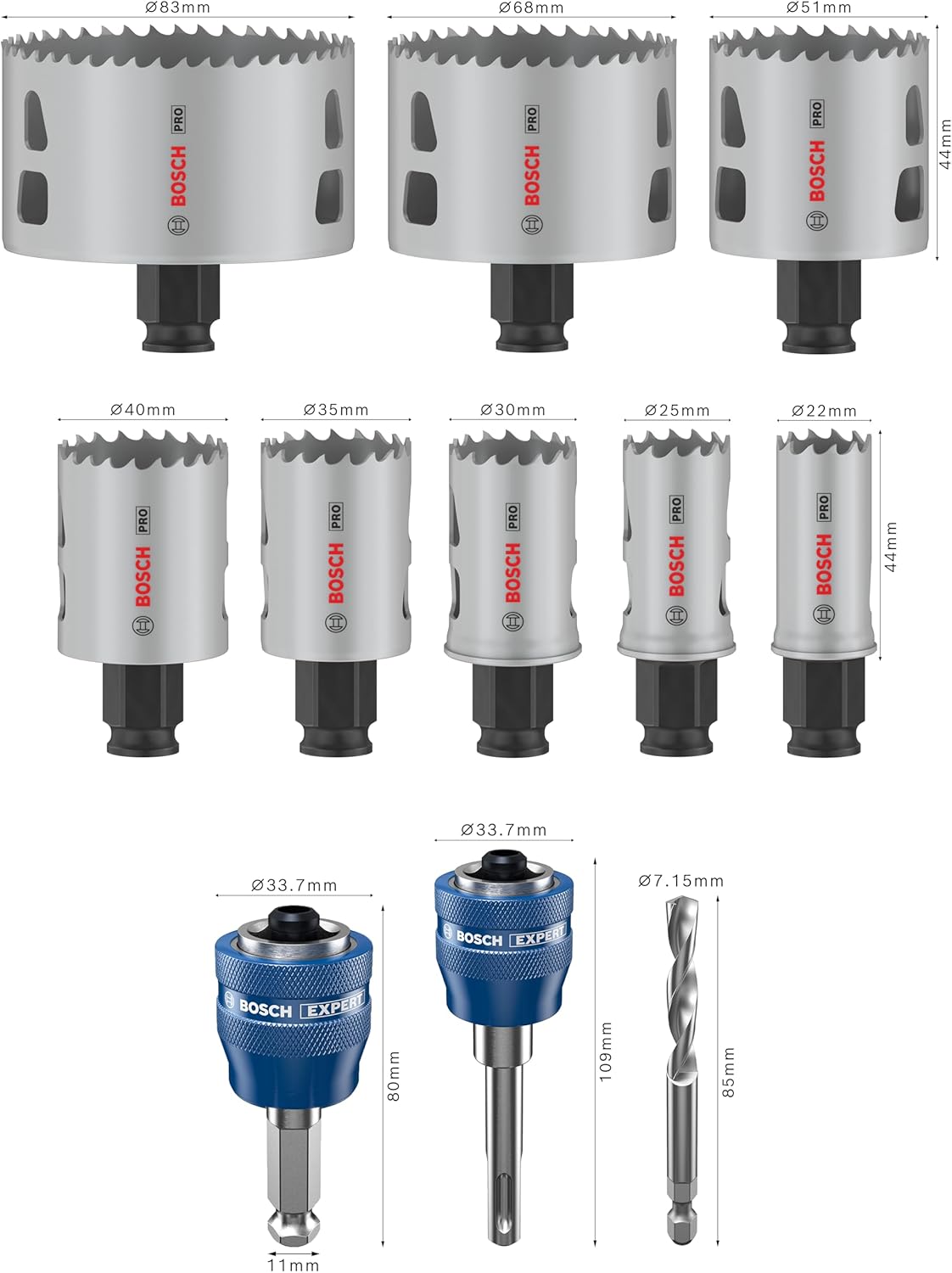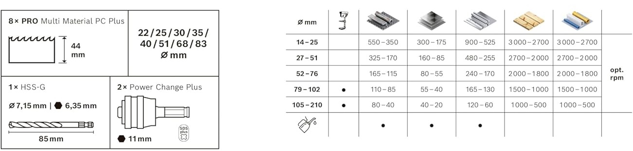 Děrovačka Pro Multi Material Power Change Plus je odolná děrovka pro rychlé řezy do dřeva a kovu. Progresivní ozubený pás nabízí optimální řezný výkon a rychlé vyhazování třísek. Tato děrovka je vyrobena z bimetalové HSS (rychlořezné oceli) s 8% slitinou kobaltu, což poskytuje nižší riziko zlomení zubů a vyšší tepelnou odolnost pro extrémní odolnost a dlouhou životnost. Tato děrovka je vhodná pro řezání dřeva, kovu a plastu. Děrovačka Progressor na dřevo a kov je vybavena jedinečným adaptérem Power Change od společnosti Bosch s nejrychlejším adaptérovým systémem na trhu. Umožňuje oddělit a připojit děrovku a středicí vrták jediným kliknutím.