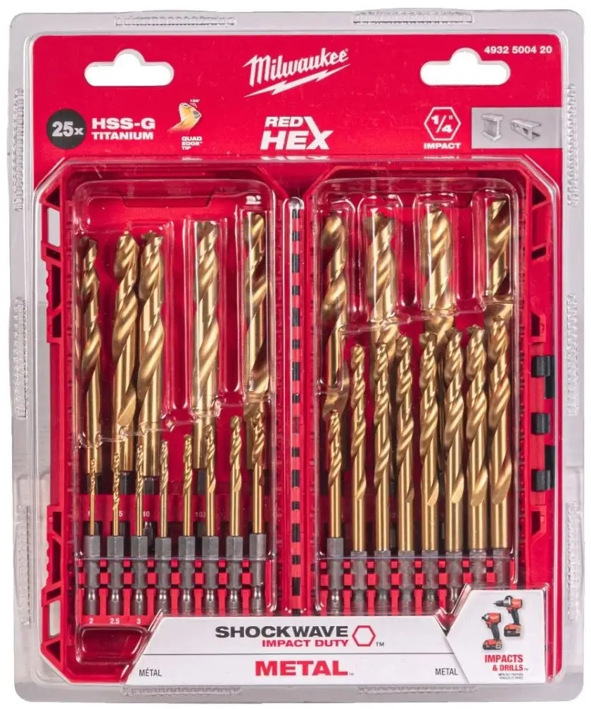 Profesionální sada kovových vrtáků Milwaukee SHOCKWAVE IMPACT DUTY se speciální 1/4" HEX stopkou pro použití v rázových utahovácích. Vrtáky jsou vyrobeny z kvalitní oceli HSS-G a opatřeny povlakem nitridu titanu pro delší životnost a vyšší odolnost při vysokých rychlostech. Konstrukce typu N a ostrý hrot 135° zajišťují přesné vedení a efektivní odvod třísek.