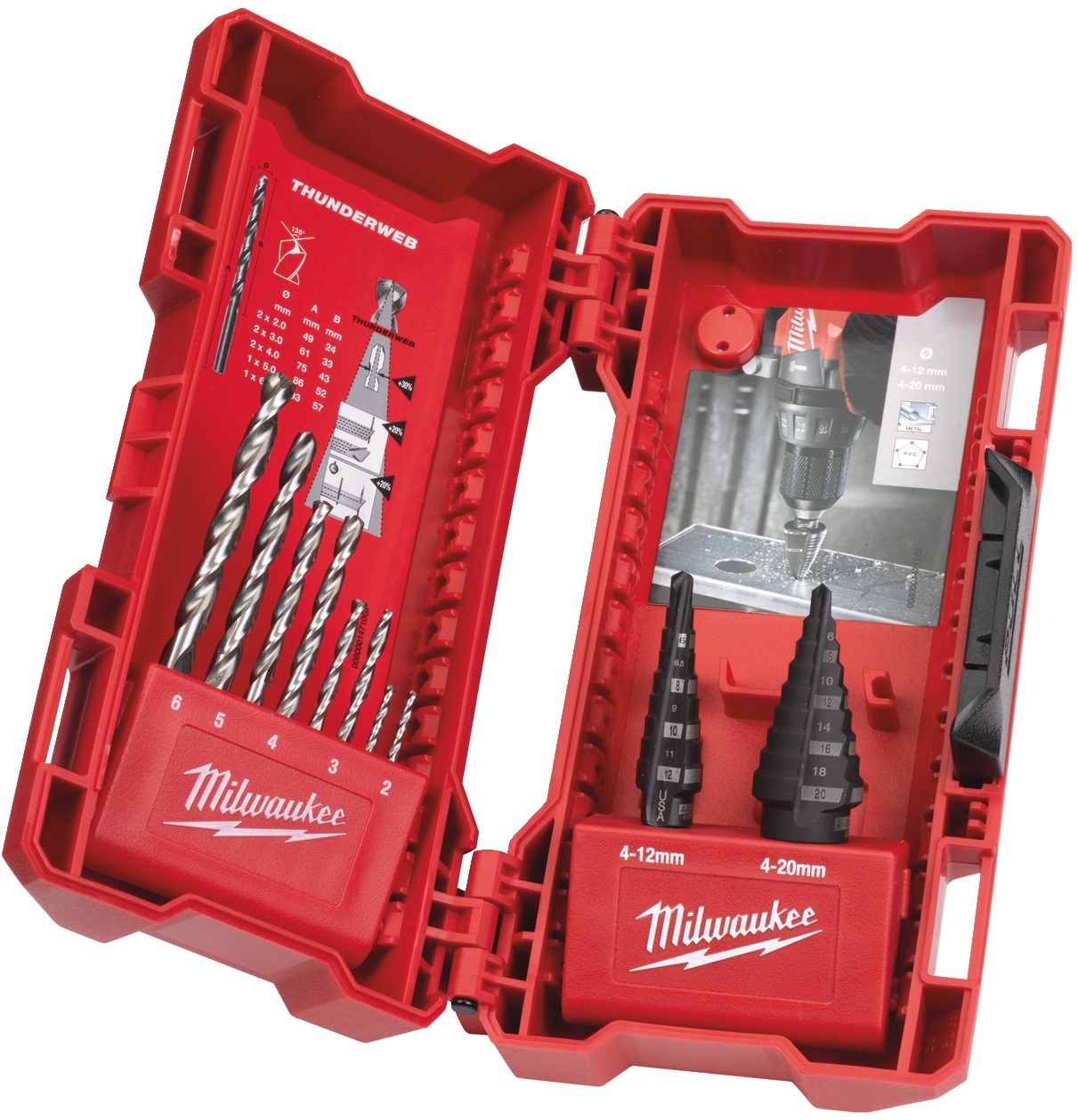 Kombinovaná sada vrtáků Milwaukee Thunderweb obsahuje stupňovité vrtáky a spirálové vrtáky do kovu pro univerzální použití při vrtání do plechů a kovových materiálů