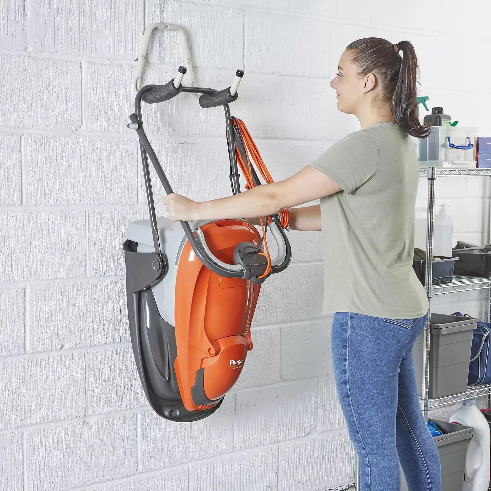 Ploché skládací rukojeti umožňují po použití sekačku zavěsit na zeď a šetřit tak místo