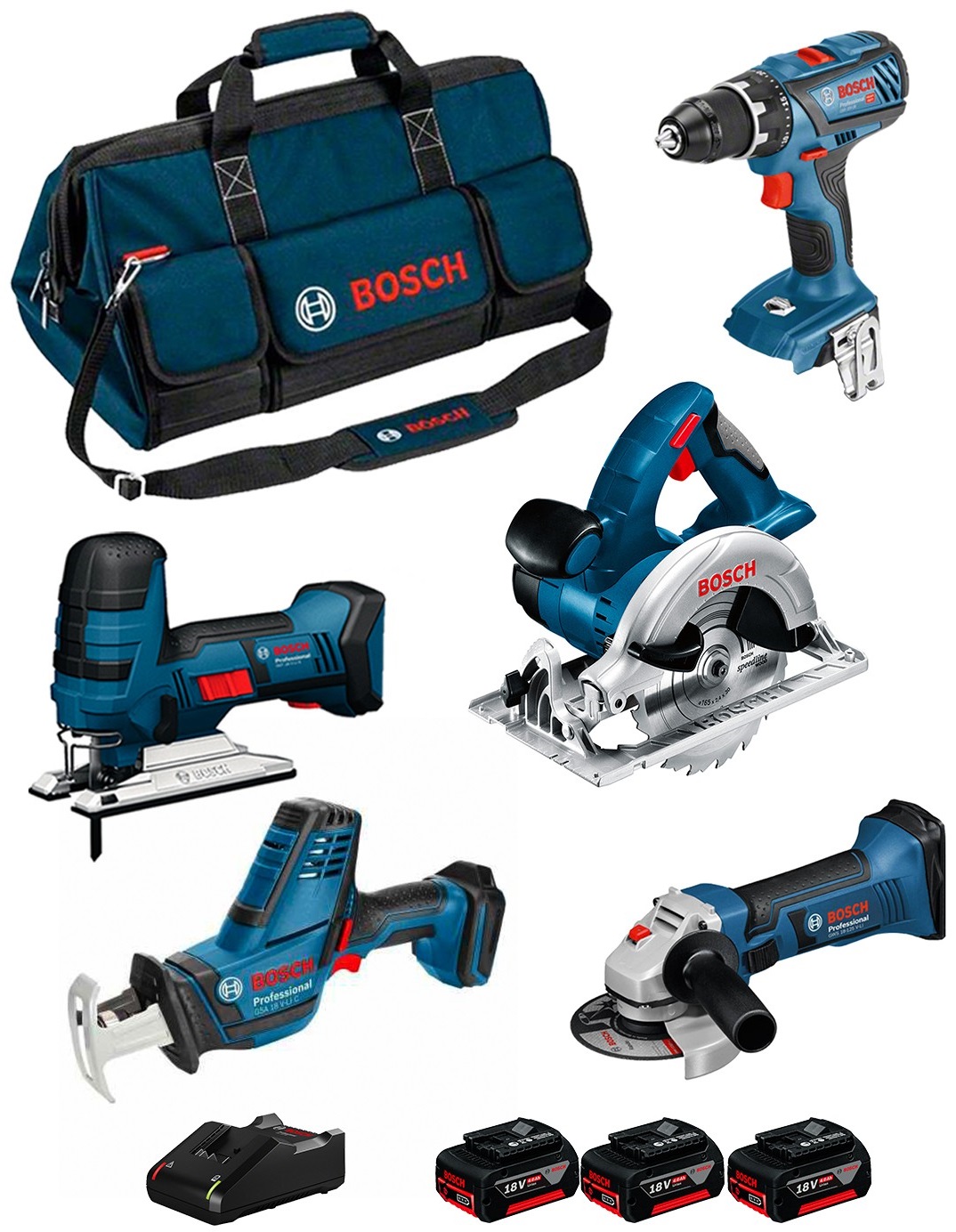 Bosch 0615990L59 aku sada GSR 18V-28 + GST 18 V-LI S + GWS 18-125V-LI + GKS 18 V-LI + GSA 18V-LI C + 3x 4,0 Ah + nabíječka + taška