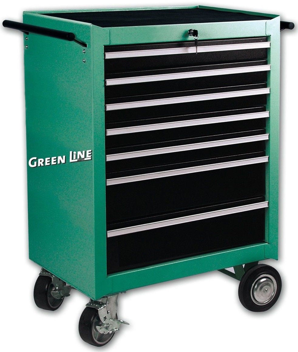 7 plně výsuvných šuplíků 4 kolečka - 2 pevná, 2 otočná pogumovaná horní plocha, rozměry 820 x 460 x 1010 mm, hmotnost cca. 100 kg