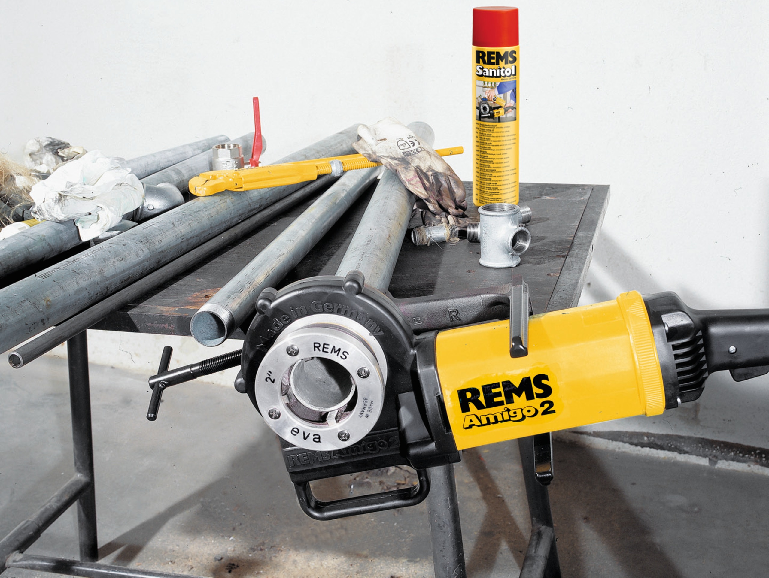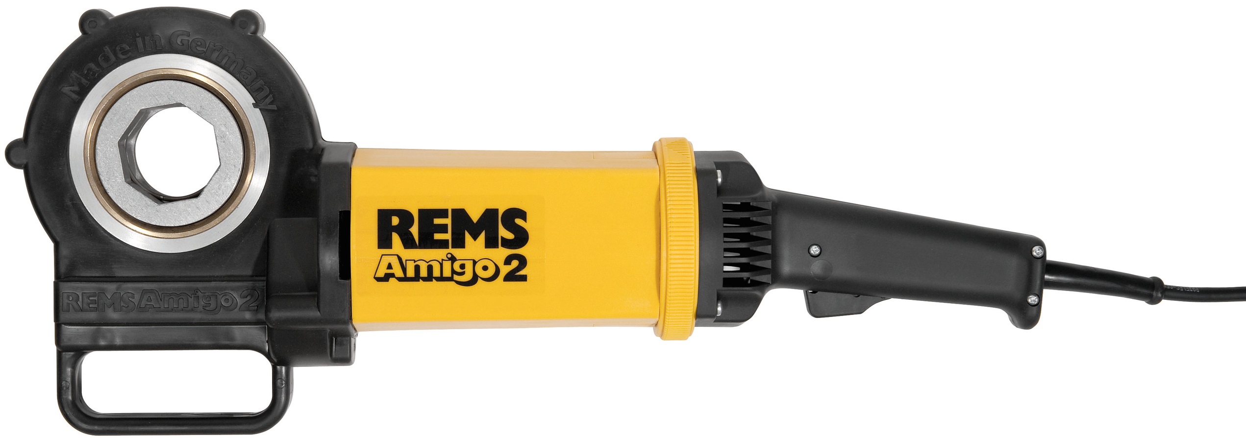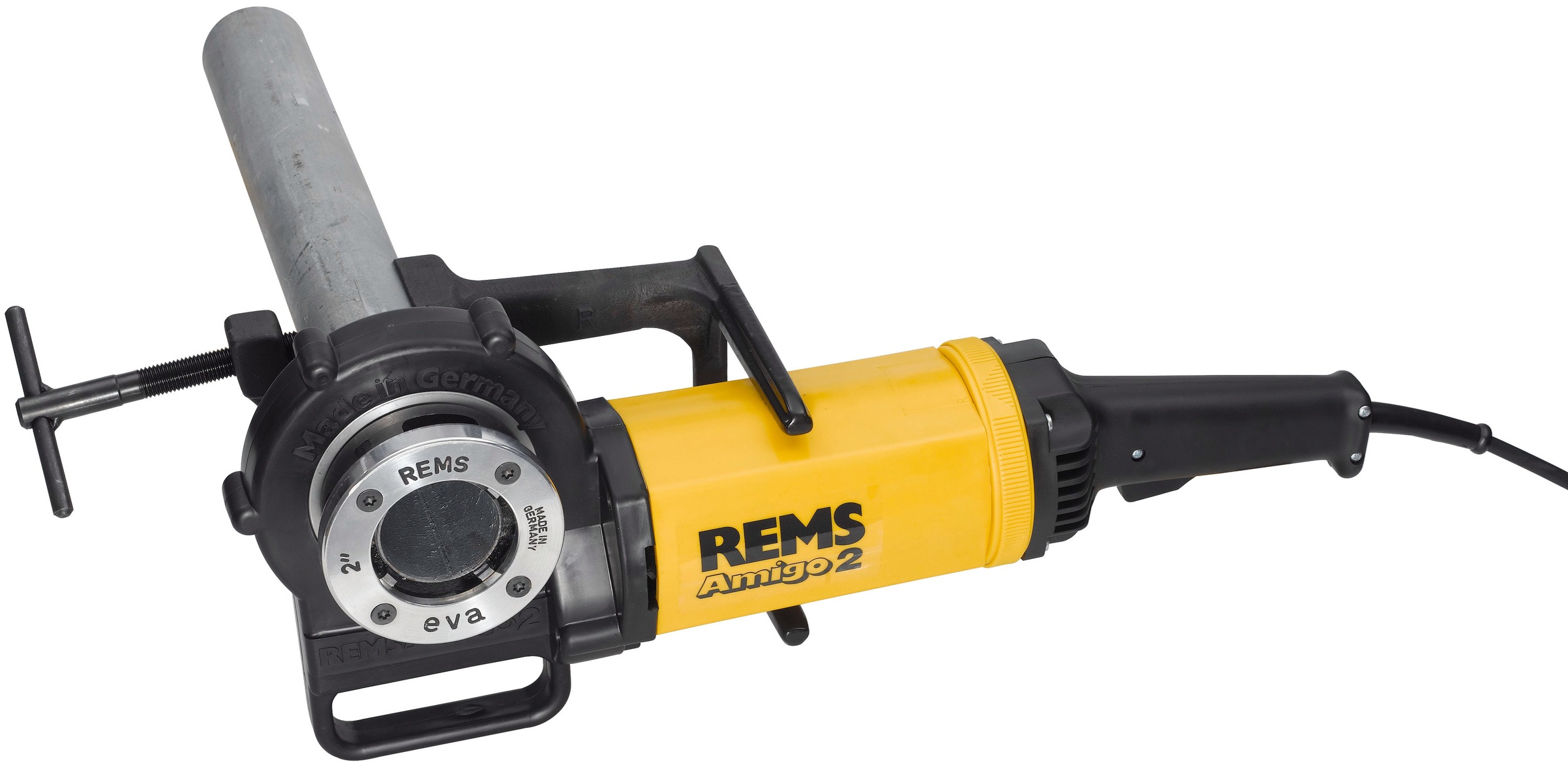 REMS Amigo 2 Set R je výkonná elektrická závitnice s rychlovýměnnými závitořeznými hlavami určená pro profesionální řezání trubkových závitů až do 2".