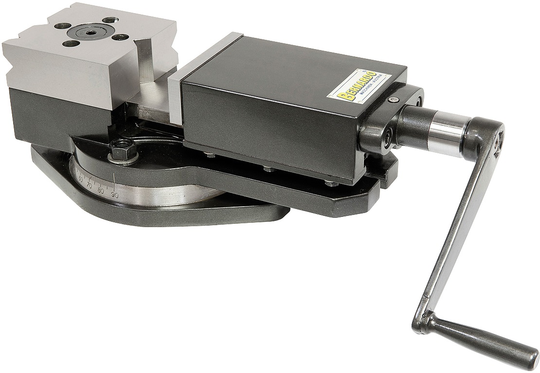 Univerzální svěrák s masivní otočnou pevnou čelistí v provedení stran - hladká, svislé prizma, horizontální prizma a kombinovaná prizma. Celý svěrák je otočný se stupnicí