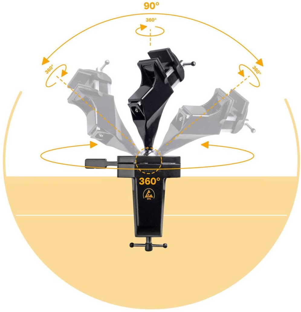 BERNSTEIN upínací zařízení SPANNFIX na kulovém kloubu jsou dobře nastavitelné a lehce otočné do všech směrů a nabízejí maximální pracovní možnosti pro snadnější a plynulejší obsluhu. Seřizovací šroub na spodním držáku umožňuje individuální nastavení rozsahu pohybu kloubu. Dlouhá životnost je zaručena velmi kvalitní, černou hliníkovou deskou z práškově lakovaného litého hliníku a ocelových dílů se zušlechtěným povrchem. Varianta ESD, s povrchovým odporem mezi 10 7 a 10 8 Ω, poskytuje maximální zabezpečení proti výbojům statické elektřiny
