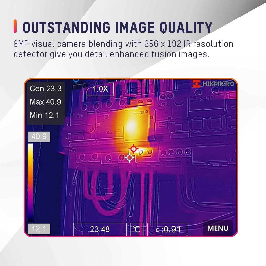 Kompaktní a odolná, snadno přenosná termokamera s 3,5 palcovým dotykovým LCD displejem o velikosti 640 x 480 bodů. Disponuje infračerveným čipem s rozlišením 256x192 bodů a 8 MP čipem pro viditelné spektrum. Umožňuje zobrazení s prolnutím kontur, obraz v obraze nebo samostatně viditelný nebo infračervený obraz. Vhodná pro průmyslové kontroly, umožňuje rychlé skenování elektrického vybavení, strojů a dalšího majetku. Disponuje technologií automatického vyhodnocení nejteplejšího a nejstudenějšího bodu, uživatelského bodu nebo zvukového a zábleskového alarmu. Wifi a USB-C pro přenos snímků nebo obrazu v reálném čase. Integrovaný akumulátor Li-ion pro až 4 h provozu.