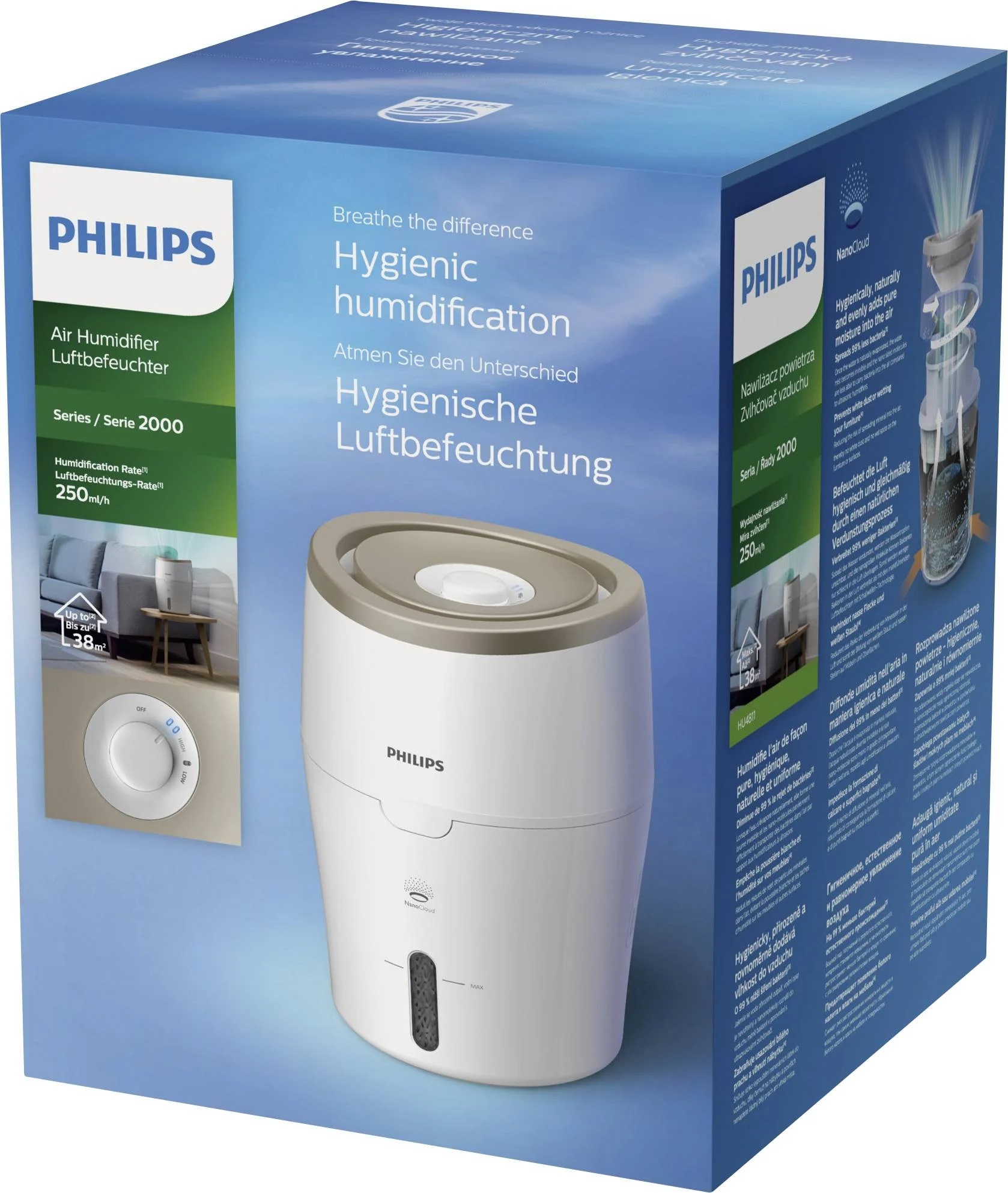 2 rychlosti ventilátoru a automatické nastavení nabízejí výkon a pohodlí dle vašeho výběru. S výkonem až 250 ml/h jsou efektivně zvlhčovány místnosti do 38 m2. (2, 3)
