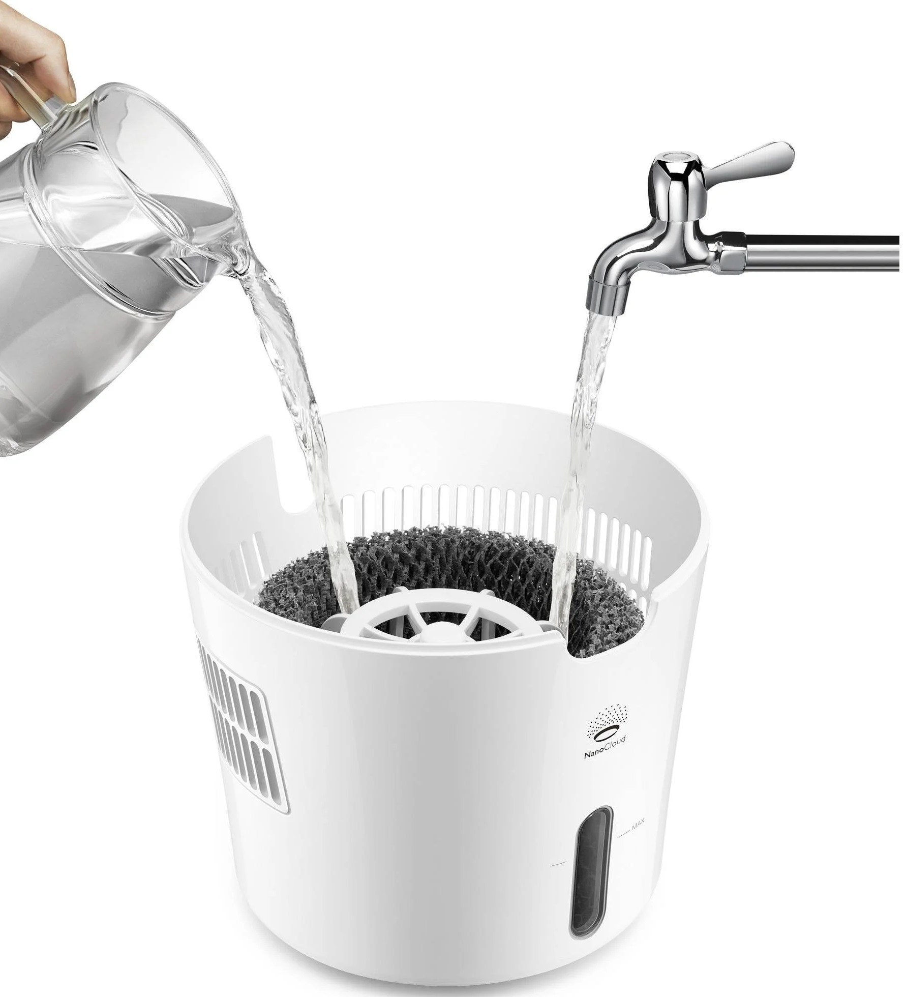 Technologie NanoCloud využívá přirozený proces odpařování, který je široce uznáván jako hygienicky bezpečný a účinný způsob zvlhčování. Nejsou použity žádné ionty, chemikálie ani ozón (5) a voda se neohřívá, takže nehrozí popálení.