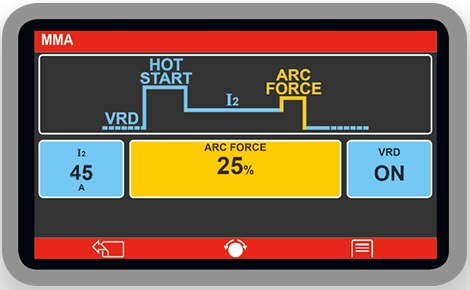 Funkce dohořívání oblouku (Burn back), nastavení elektronické reaktance, nastavitelná doba dofuku plynu, volba režimu 2/4 takt, režim bodování-stehování.