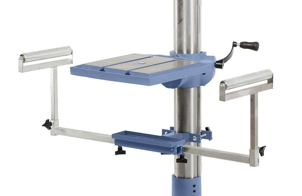 Univerzálnost: Naklápěcí vrtací stůl (± 45°) a výškové nastavení pinoly pomocí hřebenové tyče s ruční klikou umožňují vrtání otvorů v libovolných úhlech a polohách.