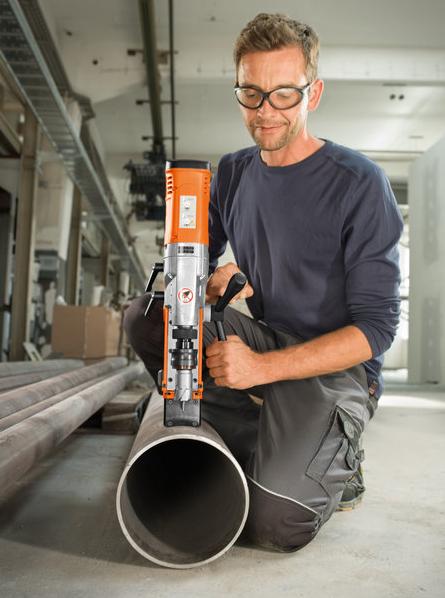 Malá univerzální 1stupňová akumulátorová univerzální magnetická jádrová vrtačka se silným zdvihem, pravotočivým/levotočivým chodem, upnutím nástroje MK2, permanentním magnetem a maximální funkčností pro mobilní práci na stavbě.