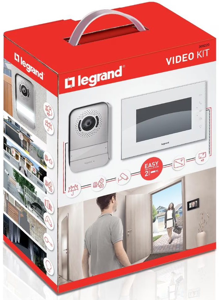 Systém videovrátného Legrand s 2vodičovým připojením, 7palcovým barevným monitorem s vysokým leskem a širokoúhlou kamerou, sada pro rodinné domy/dvougenerační domy